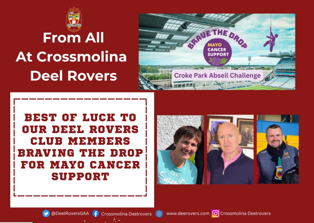 There are a brave bunch of our Crossmolina Deelrovers team mates doing a Abseil Challenge in Croke Park tomorrow for a very worthy cause: Mayo Cancer Support.